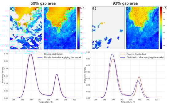 As can be seen from the figure, for 50% gap size, the algorithm practically did not distort the original temperature distribution in the image. In the case of a 93% gap as expected, the recovery was worse. For Vladivostok case the average bias value for a 50% gap size was −0.084. For a 90% gap it was equal to 0.052.