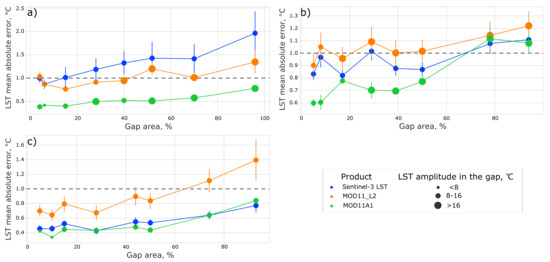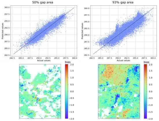 For the territory of Saint Petersburg for Sentinel-3 LST product, the value of Mean absolute error can be seen in Figure 8. The validation matrices are shown below the scatter plot, and the gaps that were generated for each case are shown in white.