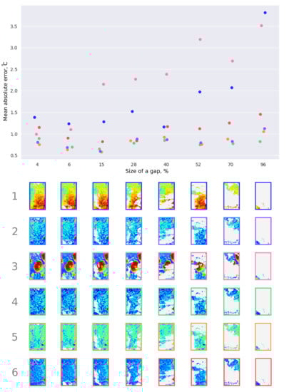 The results of validation of some modern gap-filling algorithms are refined in some articles [45], and various algorithms are compared [46]. The authors of the article [46] in 2017 compared the accuracy of algorithms in the problem of filling in gaps on different spatial datasets of the land surface temperature.