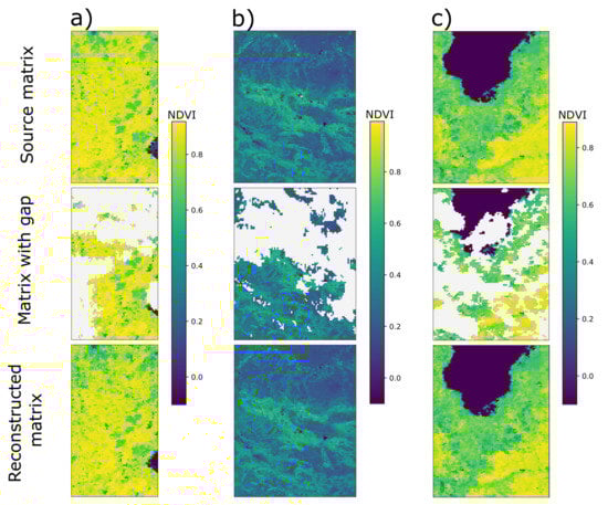 The use of gap-filling algorithms using spatial information is widespread [21,23,35,36], since satellite images are data of a geographical nature, where there are strong relationships between closely located objects (pixels or groups of pixels). Algorithms such as ordinary kriging, regression kriging, and generalized linear models are typical representatives of spatial gap-filling approaches [37]. Spatial models, such as Local Linear Histogram-Matching (LLHM) [38], performed well in filling gaps in homogeneous fields, but showed rather weak results in filling gaps in heterogeneous areas. The greatest problems for methods in this group occur when restoring large gaps. To overcome the disadvantages of spatial methods for filling in gaps, authors can use additional layers [39,40]. On the one hand, data fusion helps to achieve high accuracy. On the other hand, adding exogenous variables complicates data preparation and makes the approach less flexible and less versatile.