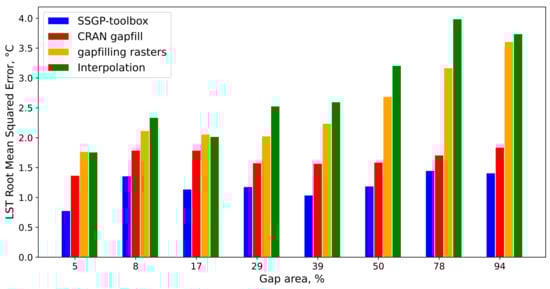 Thus, we verified the algorithm on 424 Land Surface Temperature matrices (3 remote sensing products × 3 test territories × 6 images for particular area × 8 types of gaps minus 8 because of the Vladivostok case, 5 images were used for Sentinel-3 product instead of 6), 3 NDVI and 3 albedo matrices. The accuracy was also compared with the similar open-source packages: “CRAN gapfill” and “gapfilling rasters”.