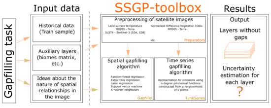 The following are available online at https://www.mdpi.com/2072-4292/12/23/3865/s1, Code with documentation and examples are available with public GitHub repository and distributed under conditions of GNU General Public License v3.0: https://github.com/Dreamlone/SSGP-toolbox. The dataset, as well as its description, which was used to compare the accuracy of the developed module with other gap-filling algorithms, is available at the link https://github.com/Dreamlone/SSGP-toolbox/tree/master/Comparison.