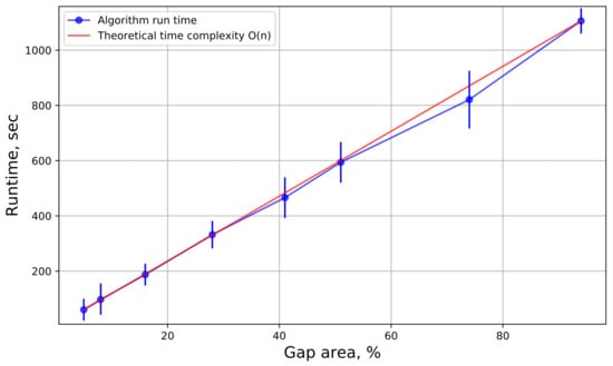 As can be seen from the graph, the time complexity of the algorithm is linear. This is confirmed by the method of constructing models, for each pixel with a gap, its own model is built, therefore, with an increase in the number of missing pixels, the processing time will also increase proportionally. On the other hand, the training time of models is greatly affected by the size of the training sample. Therefore, if there is a need to speed up the algorithm, we can reduce the size of the training sample by removing some layers from the “History” folder.