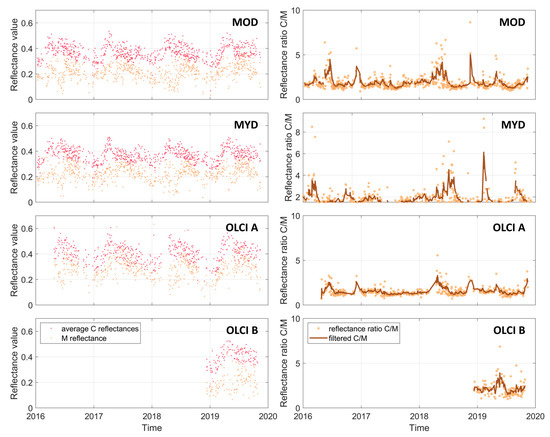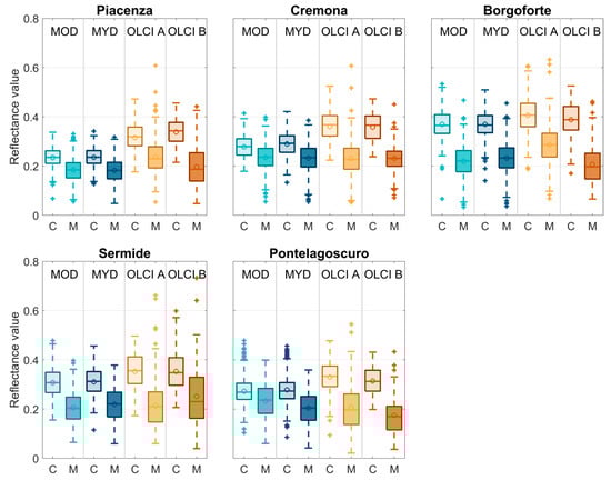 4.1. Analysis of the Reflectance for M and for C Pixels