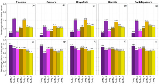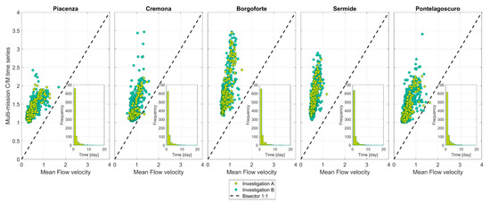 - The integration of the time series from multiple sensors provides a multi-mission time series that is in frequency well adapted to follow the temporal variation of the river including low- and high-flow periods. From the different configurations analyzed in a one-year period, the combination with only OLCI sensors is found to perform less well than the configuration with MODIS sensors. The linear combination of all sensors (configuration 1), provides good results with a very high frequency (about 1.5 days), even if the best trade-off is represented by the combination of MODIS sensors (configuration 5, with R from 0.68 to 0.77) and MODIS and OLCI Sentinel-3A (configuration 4, with R from 0.65 a 0.74), both with a daily temporal resolution. The accuracy in describing the mean flow velocity is demonstrated by the performance indices calculated: on average the RMSE is lower than 0.14 m/s, the relative rRMSE is between the 10% and the 29%, whereas the NS is higher than 0.42.