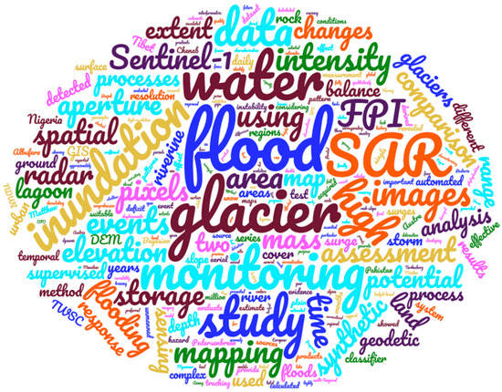 The cloud shows that among the most frequently used keywords, there are not only terms relating to the geophysical processes involved (e.g., surge, mass, deficit and storm) or the approaches employed for flood and glacier imaging (e.g., supervised classification and comparison) but also specific data types (e.g., digital elevation models), sensors and missions (e.g., Sentinel-1). The latter data, in particular, were exploited in more than one article (see Table 1) and reflect a higher-level trend that can be observed in the recent specialist literature in this field which increasingly exploits satellite Synthetic Aperture Radar (SAR) imagery. A significantly high number of articles also focused on image classifiers, probabilistic approaches and elevation and change detection methods.