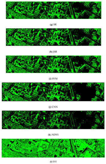 Vegetation detection maps of nine algorithms for the RGB + NIR + LiDAR (DS-5) dataset. (a) ASD; (b) MSD; (c) RXD; (d) KASD; (e) KMSD; (f) KRXD; (g) SR; (h) JSR; (i) SVM; (j) CNN.