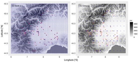 The two panels show the station sites (red triangles), together with (a) SARAH-2.1 and (b) CLARA-A2 grid points (blue circles). The filled circles identify the grid points considered for the analyses. The orography of the region is represented too.