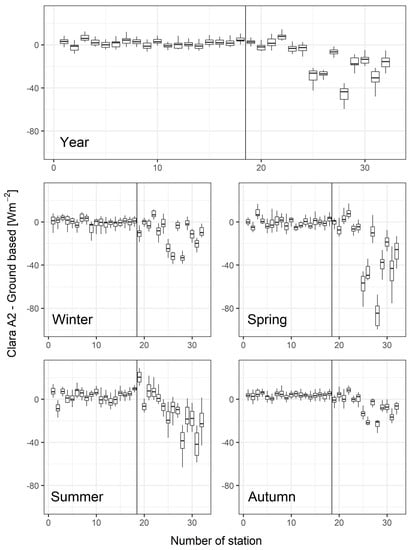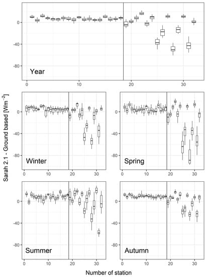 Boxplots of the differences between SARAH-2.1 annual and seasonal values and the corresponding station values for the selected subset of records (see last column of Table 1) over the period 2001–2016. The black line separates low and high OCI stations.