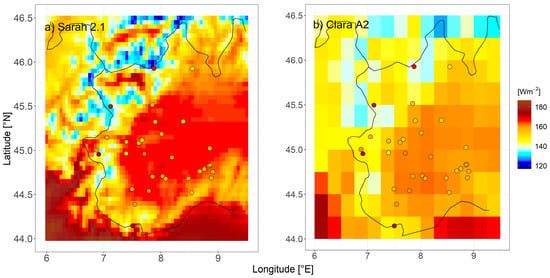 Spatial distribution of (a) SARAH 2.1 and (b) CLARA A2 annual averages (Wm−2) over the period 2001–2016. The respective averages for the selected subset of ground-based records (see last column of Table 1) are shown too.