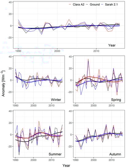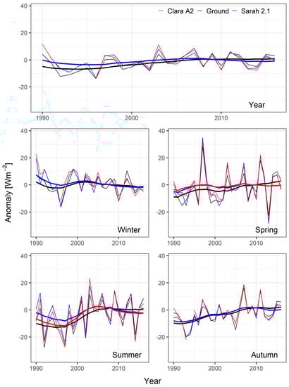 Average annual and seasonal series (thin lines) representative of low-elevation station sites for ground-based (black line), SARAH-2.1 (blue line) and CLARA-A2 (red line) datasets. In the case of records without gaps, the series were plotted together with an 11-year window, 3-year standard deviation Gaussian low-pass filter (thick lines). The series are expressed as additive anomalies from the period 2001–2016.
