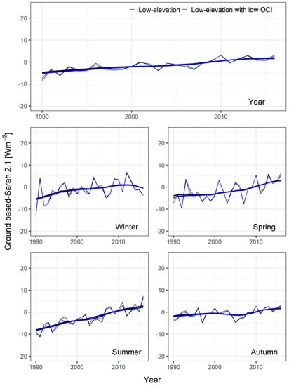 Average annual and seasonal series (thin lines) of the differences between ground-based and SARAH-2.1 low-elevation SSI anomaly records. The averages were calculated for both low-elevation station sites and low-elevation station sites with a low OCI. In the case of records without gaps, the series were plotted together with an 11-year window, 3-year standard deviation Gaussian low-pass filter (thick lines).
