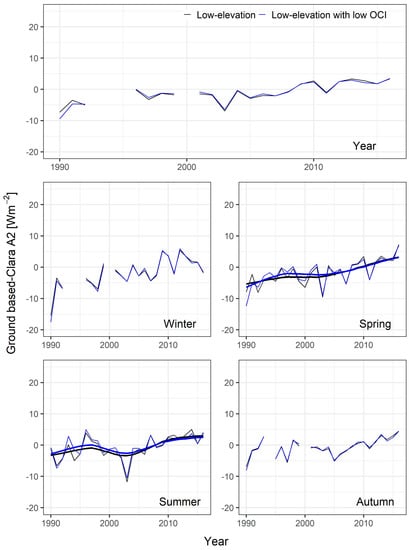 Average annual and seasonal series (thin lines) of the differences between ground-based and CLARA-A2 low-elevation SSI anomaly records. The averages were calculated for both low-elevation station sites and low-elevation station sites with a low OCI. In the case of records without gaps, the series were plotted together with an 11-year window, 3-year standard deviation Gaussian low-pass filter (thick lines).
