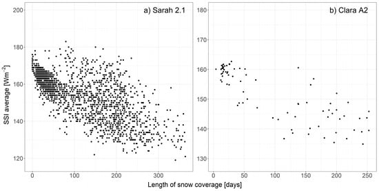 (a) SARAH-2.1 and (b) CLARA-A2 annual average over the 2001–2016 period with respect the corresponding MODIS length of snow coverage. The results refer to the same area shown in Figure 4.