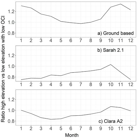 Ratio between SSI averages calculated over high-elevation station sites and low-elevation station sites with a low OCI. The ratios are calculated for (a) ground-based, (b) SARAH-2.1 and (c) CLARA-A2 records over the 2001–2016 period, and starting from the 32 station sites with ground-based records considered un-biased in terms of normal values (see Section 2.5).