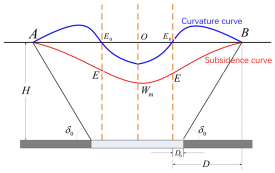 Subsidence and curvature curves of a horizontal goaf on the main section. A and B are the boundary points of the sinking basin. E is the inflection point of the subsidence curve. is the zero point of the curvature curve. H is the mining depth. is the maximum sinking point of the subsidence basin. is the boundary angle on the main section. is the inflection point offset. D is the projection distance between the boundary point of the sinking basin and the boundary of said goaf on the horizontal plane.
