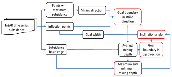 where and can be found in [13] and D can be obtained from the subsidence basin; thus, the average mining depth H can be requested. Four basin boundaries on two main sections can be obtained by differential InSAR (D-InSAR). According to [9], the boundary behind the excavation direction can be used to obtain ideal results.