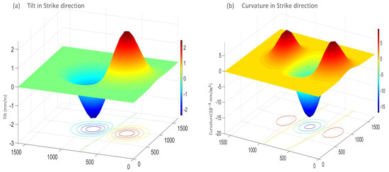 where is the curvature value at position x. In the actual subsidence basin, the surface tilt is only a few percent; therefore, is so small that it can be ignored. Then, Equation (3) can be simplified to: