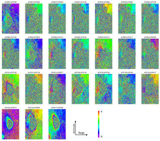After setting the thresholds of spatial baseline and temporal baseline to 1000 m and 1000 days, Delaunay triangulation was used to select the interference pair. Twenty-four interferograms were obtained from 11 SAR images, as shown in Figure 8. It can be seen from Figure 8 that severe incoherence occurred in some interferograms, and the interference fringes almost disappear. The interferograms with severe incoherence were discarded, as shown in Figure 9. Due to the large deformation and poor coherence in this region, after the multi-looks were completed, the points with coherence greater than 0.45 were retained. The phase standard deviation of the point selected by this threshold was approximately . Then, the linear and nonlinear deformations were estimated according to the method in [22,23]. This method can effectively retain the nonlinear part of the deformation, so the surface deformation can be obtained more accurately.