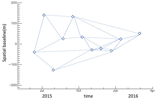 Interference pair and time–space baseline. The blue diamonds represent Singe Look Complex ( SLC ) images, the blue lines represent the interference pairs, the solid line represents the interferogram used to calculate the deformation, and the dotted line represents the interference pair that was discarded due to incoherence.