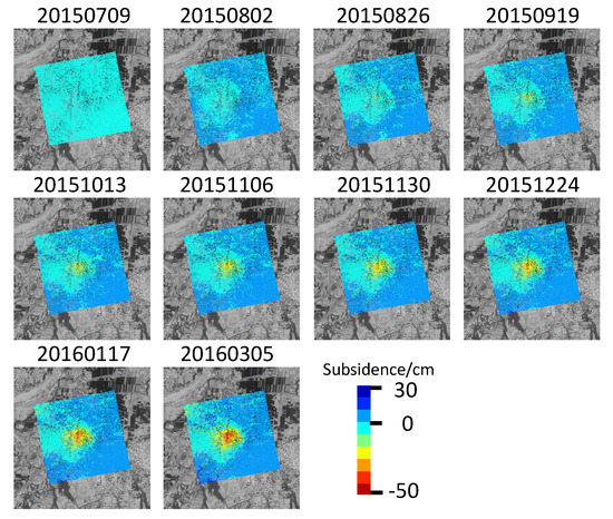 Time series of ground subsidence in the look of sight (LOS) direction. Each small chart represents the cumulative land subsidence from 15 June 2015 to the date above the chart (YYYYMMDD). A positive value means uplift, and a negative value means sinking.