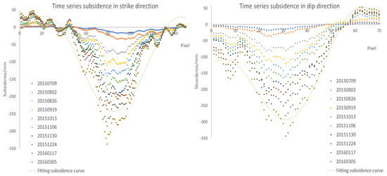 It can be seen from Figure 10 that the lower coherence threshold ensured the sufficient retention of the points that complete the basin shape. Although lower coherence means larger phase standard deviation, the accuracy of the results was still within an acceptable range. The main manifestation is that the shape of the sinking basin was complete and continuous, with no or few outliers around it. Meanwhile, the time series ground the subsidence gradually increased and shifted to the southeast. The subsidence in the eastern half was relatively slow, while, in the western half, it was more dramatic. Combined with the characteristics of the inclined coal seam in Figure 3, it can be seen that the east direction was the downhill direction, and the west direction was the uphill direction. As can be seen in Figure 11, the sinking curves of each period exhibit the same characteristics and the maximum sinking value reached 350 mm. The location of the maximum sink point shifted southward over time. The subsidence curve in the inclined direction experienced obvious asymmetry of the inclined coal seam because the observed value of InSAR fluctuated greatly, and, therefore, it was not easy to determine the position of the inflection point and the boundary point; thus, a sixth degree polynomial was used to fit the final sinking curve to obtain each characteristic point.