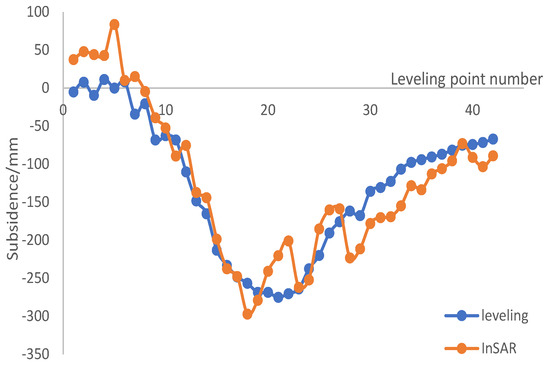 Subsidence data from 42 leveling stations were used to verify the accuracy of the InSAR results. The error of the leveling data was less than 1 mm, and therefore can be regarded as real subsidence. In order to avoid accidental errors, the InSAR results were obtained by inverse distance weighting from the five points closest to the leveling station. The root mean square error (RMSE) was 35.28 mm. The comparison is shown in Figure 13. The InSAR results fluctuated at the edge and center of the sinking basin, but the overall trend remained the same. It can be seen from Figure 11 that most of the fluctuations in the InSAR monitoring results could be removed by polynomial fitting. Therefore, the method in this paper is more dependent on the accuracy of the monitoring of the deformation trend, rather than absolute accuracy.