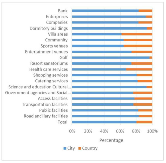 As shown in Figure 3, the number of POIs distributed in urban built-up areas accounts for approximately 80% of the total number of POIs, which is four times the number of POIs distributed in non-built-up areas. In the separate categories of POI data (refer to the POI classification of Amap), Golf areas accounts for the highest proportion of urban built-up areas, which is close to 97%, while villa areas account for the highest proportion of non-built-up areas, which is close to 40%. The proportion of other types of POI is within this range.
