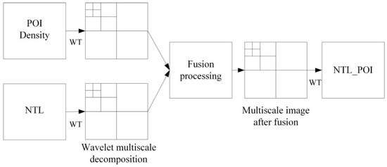 In order to fuse night light with POI density, the interactive relationship between time and frequency should be fully considered in the selection of algorithm. The wavelet transform is a representation between the function time domain (spatial domain) and frequency [51]. With its “microscope” focusing function, it is possible to achieve the unification of the time domain and frequency domain [52]. Wavelet analysis has good localization properties in both the time domain and frequency domain. Wavelet analysis highlights some features of the image through a “time-frequency” window that changes with frequency and a local “focusing” analysis of time (space) frequency, which can decompose a signal into an independent part of the signal to space and time without losing the information contained in the original signal [53]. The basic formula of the wavelet transform is described as follows: