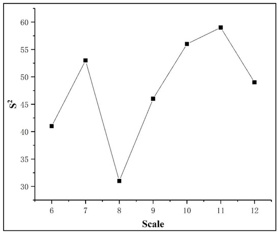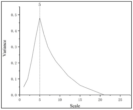 The first step of using the wavelet transform to fuse POI and NTL images is to perform wavelet transforms on POI and NTL. When the wavelet coefficients are situated in the four frequency bands of LL, HL, LH, and HH and the absolute value of the wavelet coefficient is the largest, it corresponds to the prominent feature part of the image. Therefore, provided that the absolute value of each wavelet coefficient in the transform domain is the largest, it can realize the fusion of wavelet coefficients at all resolution levels, and the fused wavelet coefficients have preserved more frequency band characteristics intact [40]. When processing image signals, the optimal scale is determined by analyzing variance diagrams of wavelet coefficients at different scales. The optimal scale for image fusion determined in this study is 5 (Figure 9).