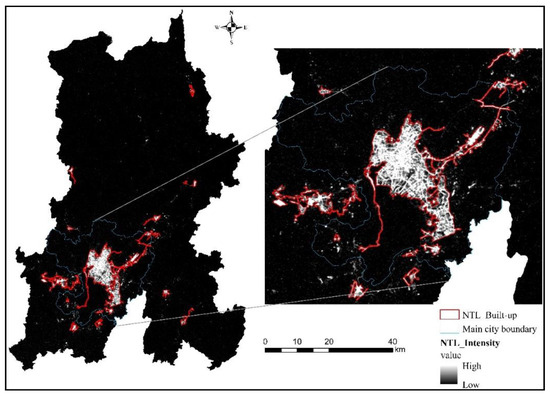 In the extraction of urban spatial structure, surface information reflected by remote sensing images gradually replaces statistical indicators, such as economic activities and population density. Compared with administrative statistical indicators, surface information can show urban spatial differences in more detail [12]. As one of the most common data in remote sensing images, night light can not only reflect the urban infrastructure function through the brightness of urban light at night but also directly reflect the distribution characteristics of the urban population and economy. At present, night light data have a good effect in monitoring and identifying urban built-up areas [13,14,15,16].