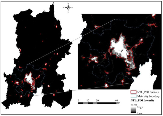 In addition, some residential areas, streets and shopping malls in the city do not generate lights at night on the urban micro scale, so there will be a “lighting void” in the city, which is also in line with the actual development status of the city [61]. While the NTL_POI data are integrated with the POI data, although there is no light brightness in the “void” of the city light, there is a clustering phenomenon of POI, so the NTL_POI data can make up for the city “void” phenomenon, which makes the urban space more integrated in both macro and micro levels, and greatly improves the extraction effect of urban built-up areas.