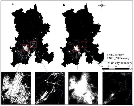Based on comparing the NTL data and NTL_POI data in Figure 12, it can be found that the two data are relatively similar in a macroscopic view. Compared with traditional population data and GDP data, NTL data and NTL_POI data can describe the spatial structure of cities more intuitively and thus have good application prospects in identifying urban built-up areas. By observing the high and low value distribution areas of the two cities, the light intensity and NTL_POI value of NTL decrease from the central area to the edge of the city to the rural area, and the spatial distribution of high-value areas of the two cities is roughly the same.