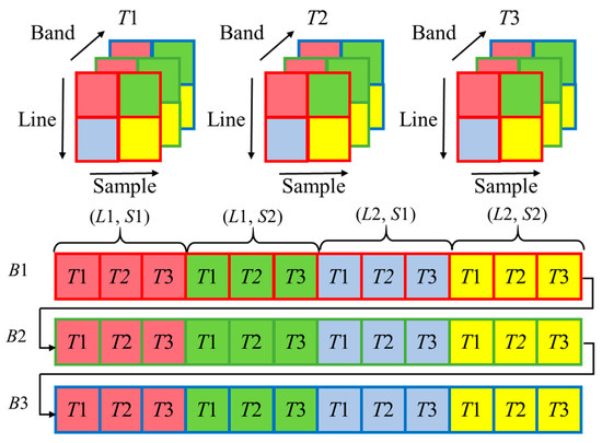 The existing remote sensing datasets are based mostly on 3D datasets, in which temporal arrangements are not included [19]. The fast 3-dimensional convolutional neural network-based spatiotemporal fusion method (STF3DCNN) draws on the idea of multidimensional datasets in the four-dimensional mode [17]. The MDD arranges data in four dimensions: time, space (height and width), and spectrum. The storage structure of MDD is called SPATS (SPAtial-Temporal-Spectral). It mainly consists of five data formats, and each has different forms of data arrangements. They are: Temporal Sequential in Band (TSB), Temporal Sequential in Pixel (TSP), Temporal Interleaved by Band (TIB), Temporal Interleaved by Pixel (TIP), and Temporal Interleaved by Spectrum (TIS). Similar to the TIP structure shown in Figure 1, our method first organizes data in chronological order. Then, the data are stored in the order of “row first, column second”. Finally, the data are arranged in a spectral order.