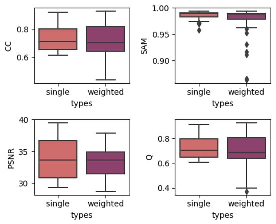 In order to show the overall effect of utilizing temporal weights, we used the results of two temporal strategies, which contain the results of models with all depths, to construct a boxplot to show the effect of utilizing temporal weights. The results are produced by grouping the single-date prediction results together regardless of the depths or dates of images. The results for three different datasets are shown in Figure 4, Figure 5 and Figure 6. In each subplot, the x-axis represents the weight strategy and the y-axis represents the different fusion indices. As shown in Figure 4 and Figure 5, the results of the CIA and LGC datasets have the same tendency: the temporal weighted results are worse than the single-date prediction results across all the fusion quality indices. Additionally, the ranges of the temporal weighted results are larger than those of the single-date results. The more abrupt or unpredictable the change in the dataset, the more obvious the tendency (judging by boxplot ranges and averages). However, for the RDT, the temporal weighted prediction yielded better results, with smaller ranges, compared with the single-date prediction. The reason for this may be that, when the landcover undergoes abrupt or irregular changes, the temporal weight strategy averages the abrupt changes, decreasing the accuracy, but when the landcovers change regularly, the temporal weights combine the changes to obtain the results. Thus, this method may depend highly on landcover changes. However, for the three datasets, the characteristics of the outliers are the same. The outliers of the single-date results are close to the maximum/minimum of the boxplot, yet the outliers of the temporal weighted results are far away from the maximum/minimum of the boxplot. This may indicate that the temporal weighted method may cause some uncertainties.