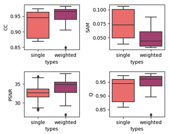 - Universal image quality index (UIQI, Q) [26]: The UIQI is a fusion evaluation index related to the correlation, brightness difference, and contrast difference between images. The formula for calculating the UIQI index of the k-th band of the image before and after fusion is:where represents the co-standard deviation between the corresponding bands of the two images. The ideal value of UIQI is 1. The closer the index is to 1, the better the fusion effect is.