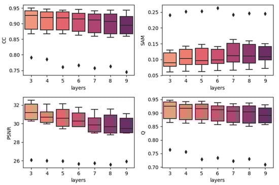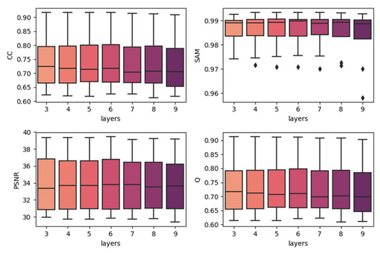 To show the effects of network depth, we generated boxplots of experiments with different network depths. The results are produced by combining the results of the same depth together with the best temporal strategy, regardless of the predicted dates. The results are shown in Figure 7, Figure 8 and Figure 9. In each subplot, the x-axis indicates the depth (layers) of the utilized model, and the y-axis represents the values of the different fusion indices. In the three datasets, increasing the model’s depth did not increase the accuracy. In the CIA and LGC datasets, the accuracy decreases when the depth increases. As the depth increases, the outliers become more distant from the other values. In the RDT datasets, although the tendency was not very clear, as the depth increases, the accuracies do not significantly increase. The outliers do not show the same tendency with CIA and LGC, and this may be due to the reason mentioned in Section 4.1: the temporal weighted strategy may cause some uncertainties in certain points. Since the computational cost and running time increase when the depth of the model increases, three-layer fully convolutional networks are the best choice for our method. It is not worth the cost to use more layers, particularly for the architecture with residual series. This may be due to the reason that the features of the residual series are not obvious and it is easy to cause overfitting. As the depth increases, it becomes easier to learn the mappings too delicately.