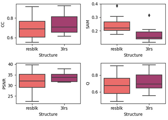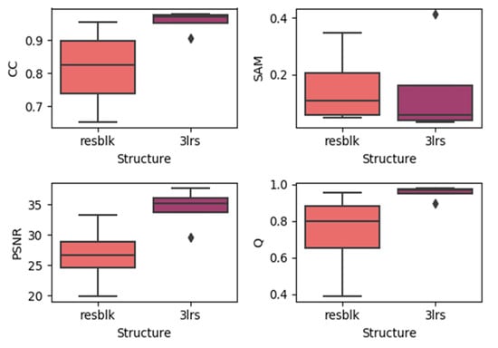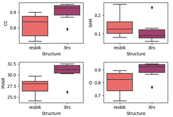 Here, we generated boxplots of experiments on the three datasets with residual blocks and three-layer networks (regardless of the prediction dates), which are presented in the Figure 11, Figure 12 and Figure 13. In each subplot, the x-axis represents the utilized model with the residual block (noted as resblk) and the model with three convolutional neural network layers (3lrs). The y-axis indicates the values for different validation indices. With all the datasets, utilizing residual blocks did not increase the accuracy and instead decreased the average accuracy as well as further increasing the divergence in the results. In addition, as the residual blocks were utilized, the processing time was increased. This may be due to the fact that, in a more sophisticated model, it is easier to cause overfitting when the feature is not obvious.