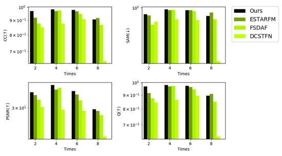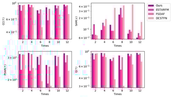 Figure 14, Figure 15 and Figure 16 show bar charts of the four indices for each method. For each subplot, the x-axis represents the dates indexed in chronological order and the y-axis represents the different fusion indices. Experiments on the CIA dataset show that the CC and Q were slightly lower for our method than for the other methods from a general perspective, but were not the lowest in all experiments; however, our method performed the best in terms of the other indices among all spatiotemporal fusion methods used in the experiments from a general perspective. For the SAM and PSNR, our method performed the best in seven predictions. Experiments on the LGC dataset show that for the CC, PSNR, and Q, our method outperforms other methods in five predictions. For SAM, the results of our methods are slightly poor yet still not the worst among all the methods in the experiment. Experiments on the RDT dataset indicate that our method yields the best results.