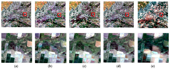 RGB composites (Red-Band 3, Green-Band 2, Blue- Band 1) of the results of the CIA dataset on date 10 (overall and in detail): (a) reference image, (b) STF3DCNN, (c) ESTARFM, (d) FSDAF, and (e) DCSTFN.