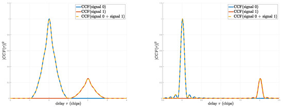 Three scenarios are then considered: scenario (a) presents the simple case where signals are clearly parted. Scenarios (b) and (c) present the case when the secondary signal is within 1 chip, and therefore there exists a strong interference between both signals. For illustrative purposes we show the normalized cross-correlation function (CCF) in these three scenarios for both signals in Figure 2.