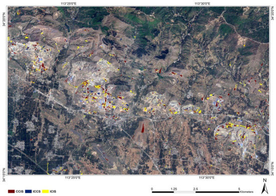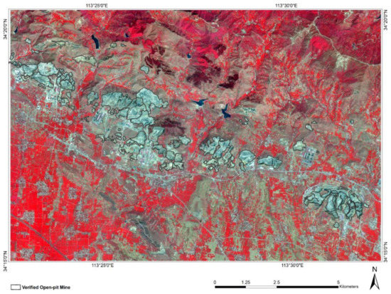 OM areas in this study area were visually identified on GF-2 images. Then, a series of field surveys were carried out from 27 August to 26 September 2018, with the help of Geological Environmental Monitoring Institute of Henan Province. After the field surveys, 105 Oms, which covered a total area of 9.36 km2, were mapped, accounting for 9.12% of the area of the study area. The largest area of OM is 0.65 km2 while the smallest is 1161 m2. Finally, all the mapped OMs were subsequently digitized and rasterized into the same resolution (4 × 4 m) as the HSRSI used for the study in Environmental Systems Research Institute’s ArcGIS software (Version 10.3.0). Figure 2 shows the open-pit visual interpretation key and field photo of the field work in the study area of this paper.