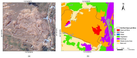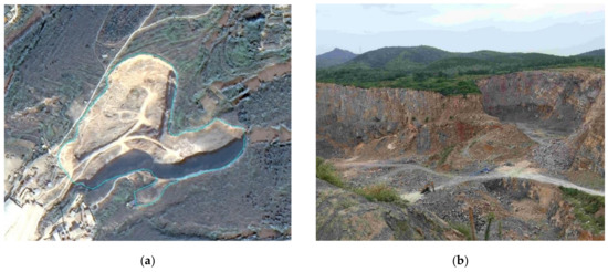 Visual interpretation key and field photo of open-pit mine. (a) Visual interpretation key of open-pit mine; (b) field photo of open-pit mine.