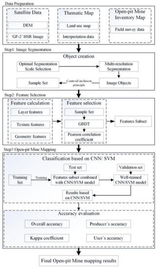 In this paper, a new effective OOMM framework for Gaofen-2 (GF-2) HSRSI based on CNNs is proposed. First, a multi-scale segmentation (MSS) method is used to extract three object-feature domains from the GF-2 HSRSI: spectral, texture, and geometric features. Then, gradient boosting decision tree (GBDT) and the Pearson correlation coefficient are used as an object feature information reduction (FIR) tool to recognize the important features that describe OMs. Finally, the CNN was used by combing the significant features to map the OM, and the mapping results were compared with that of the support vector machine. In total, 105 OM sites were extracted from the interpretation of GF-2 HSRSI and the boundary of each OM was validated by field work and used as inputs to evaluate the OMM accuracy. This research aims to explore the applicability of FIR methods and CNN algorithm under an object-oriented framework for OMM using ‘GF-2’ HSRSI.