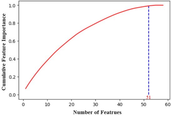 The importance value was set as the average value of the 10 times training of GBDT to reduce the random error. Since there is no universal guideline for determining the threshold of cumulative importance value without a trial-and-error method, we set the threshold to set to 0.99 after several trial-and-error attempts to keep the most important features. Features that do not contribute to achieving 99% total importance value were eliminated. Figure 5 shows the overall cumulative importance curve. From Figure 4, we can see that 51 out of all 58 features have a cumulative importance of 99%. The cumulative importance of the remaining seven features is only 1%, which can be eliminated. These seven eliminated features are Brightness, GLCMall dir. (Dissimilarity), GLCMall dir. (Entropy), GLCMall dir. (Contrast), GLCMall dir. (Mean), Border index, and Elliptic fit.