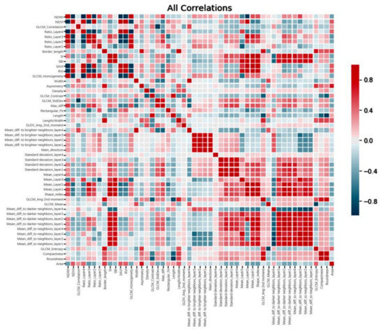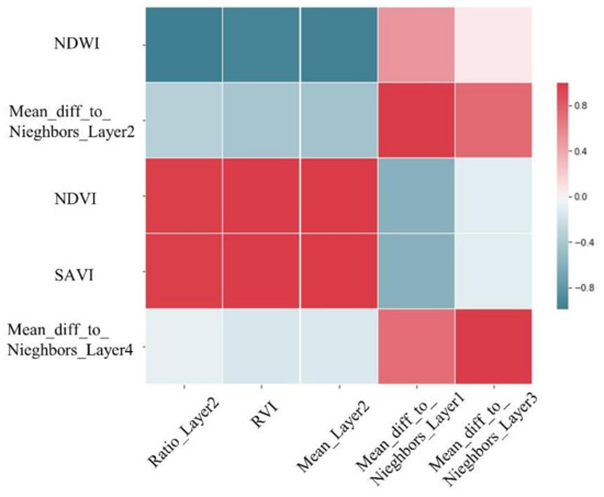 After the elimination of the least important features, the collinearity among the 51 remaining features was analyzed by using the Pearson correlation coefficient. Then, the feature pair whose correlation absolute value is greater than the threshold value was selected, and one feature from the feature pair was removed. The trial-and-error method was also used to determine the threshold value of the Pearson correlation coefficient, which was set to 0.98 in this study to avoid eliminating too many features, and five features were removed. The thermodynamic chart of these 51 features and eliminated five features are shown in Figure 6 and Figure 7. The five eliminated features are Mean_2, Ratio_2, Ratio vegetation index, and Mean Diff. to Neighbors_(1,3). In total, the features employed in the final OMM were decreased from 58 to 46 (see Table 4).