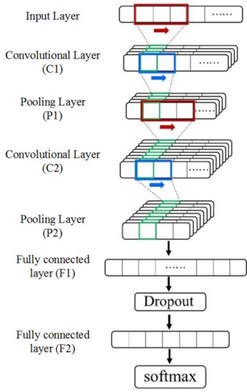 A CNN network structure, including two convolutional layers, two pooling layers, two fully connected layers, and one dropout layer, is constructed by using the sequential model in Keras. The form of convolution uses one-dimensional convolution, and the network structure is shown in Figure 8.