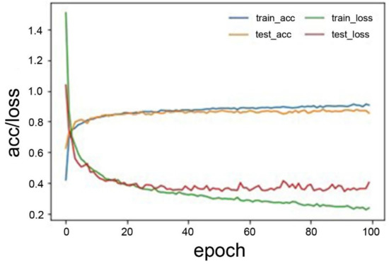 After the CNN is constructed, the TTS is employed to train the model and verify the learning effect. The Cross-Entropy Loss function [54] is selected to judge the differences between the predicted result and the reference value, while the Adam was applied as the optimization function. Figure 9 shows the Convergence curves of TTS of CNN.