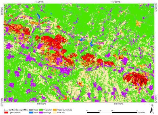A GF-2 HSRSI captured on 16/04/2018 was employed in this study, which has four multispectral bands (Red, Green, Blue, and Near Infrared) with a spatial resolution of 4 m. Land use categories (LUCs) of the study area were classified into seven dominating groups, including OM, waste-dump area (WDA), buildings (BUI), vegetation (VEG), road (ROA), water (WAT), and bare soil (BAS), according to the land use map provided by the Geological Environmental Monitoring Institute of Henan Province.