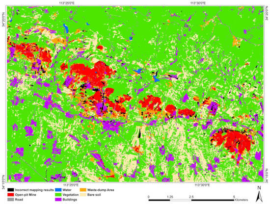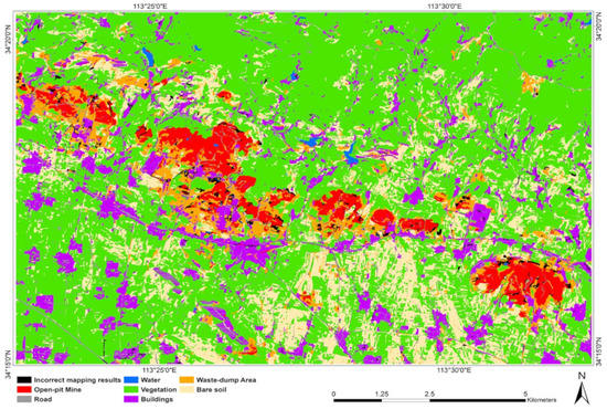 Figure 12 and Figure 13 shows the incorrect mapping results of CNNOMM and SVMOMM, respectively. The incorrect mapping results shown in Figure 12 and Figure 13 are consistent with that shown in Table 6, as most of the wrongly mapped LUCs are around the mining area. Figure 14 shows the results of the incorrect identification of CNNOMM and SVMOMM together. The yellow color represents the LUC, which is incorrectly mapped by both CNNOMM and SVMOMM. Most of them were WAT or OM LUC category, which indicates that these two LUC categories are easily misclassified between each other; the main reason is discussed in Section 4.1.